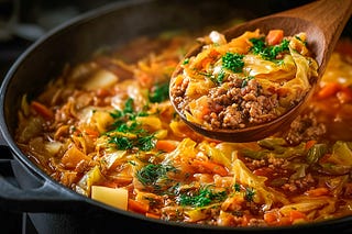 A nourishing, veggie packed soup with ground beef, cabbage, and sauerkraut for big flavor.