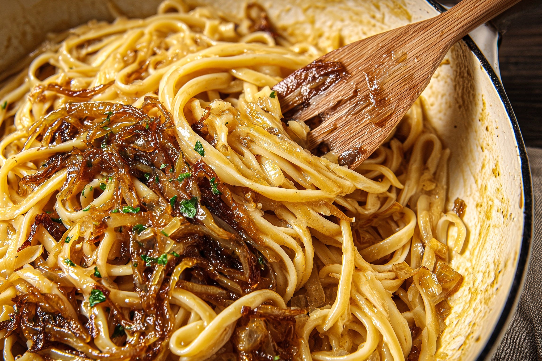 Caramelize the onions in advance for the pasta dish: Cut two onions into half-rings and cook them with two tablespoons of butter over a medium heat for about seven minutes until soft. Add a generous pinch of salt and reduce the heat to low. Cook for a further 25 minutes, stirring occasionally. Store in a sealed container in the fridge or freezer.