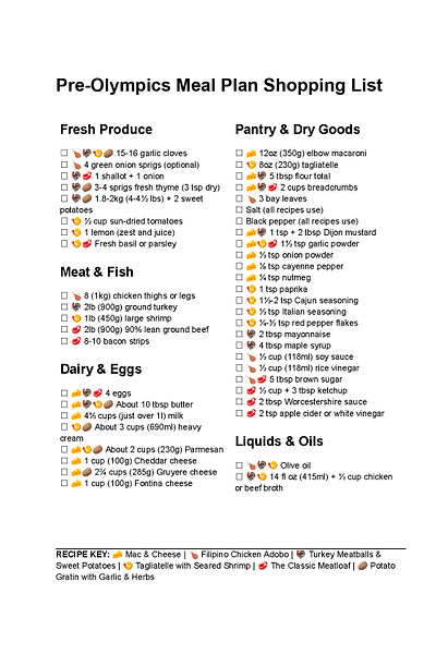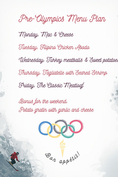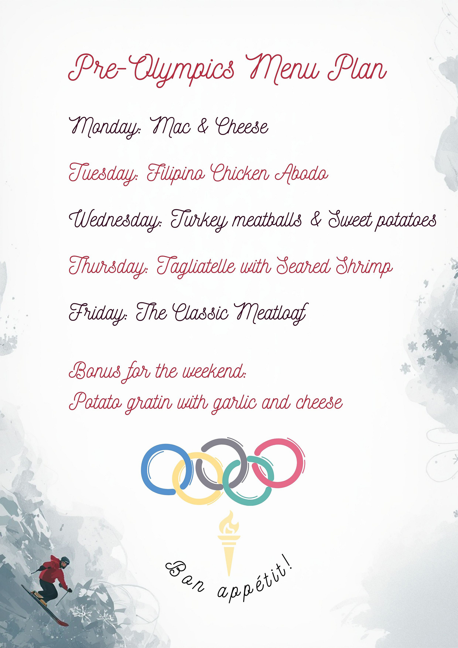 This week’s meal plan contains a balanced menu fit for champions! We will be cooking pasta twice, since it’s widely known that this is what athletes eat before a long run to sustain their energy levels with a good portion of carbohydrates. Almost all of the dishes on the menu can be prepared in advance, with minimal effort required just before serving. For Friday night, we’re planning the classic meatloaf, so you can enjoy the leftovers with the old-time favorite potato gratin for Saturday or Sunday lunch while watching the Olympics opening ceremony.