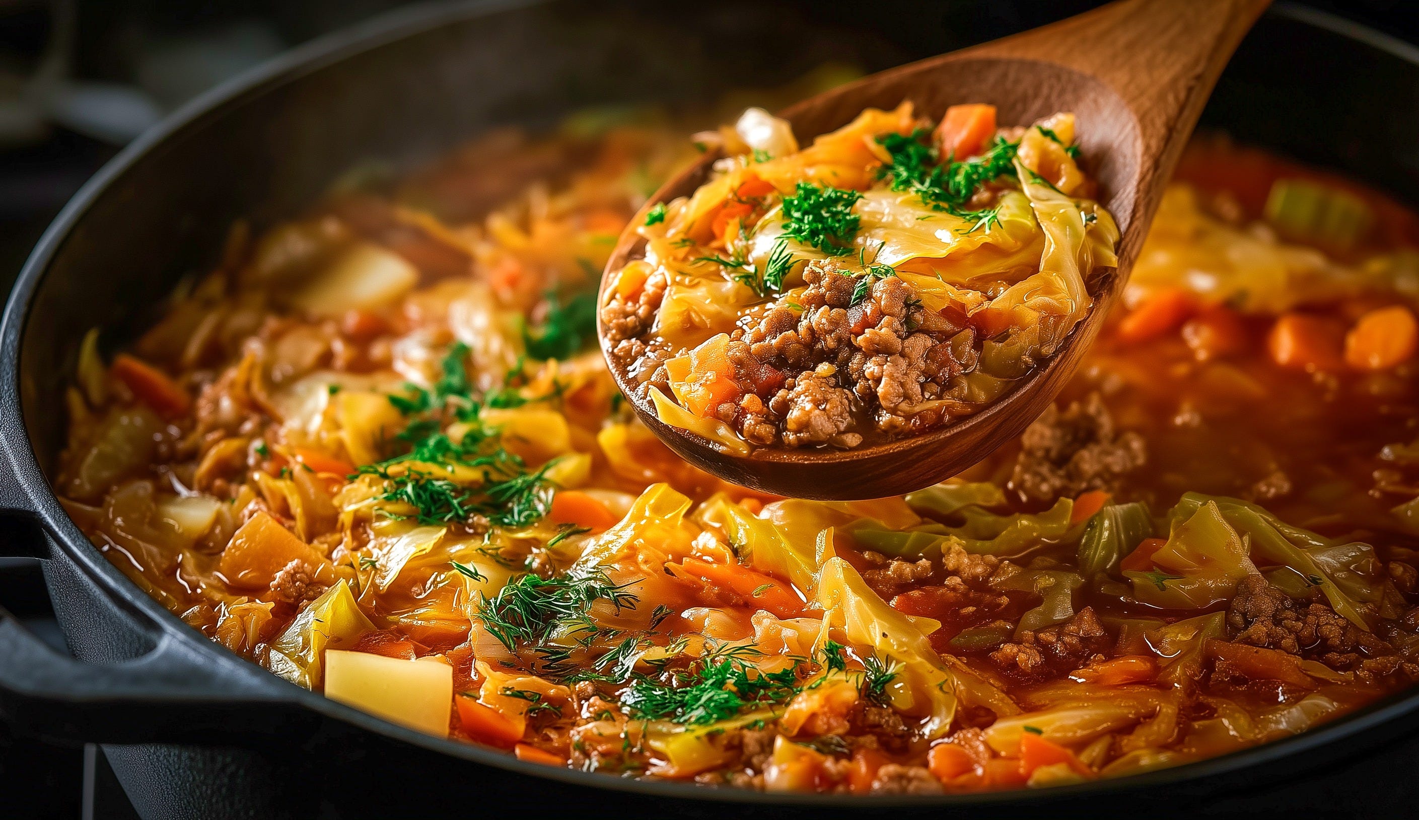 A nourishing, veggie packed soup with ground beef, cabbage, and sauerkraut for big flavor.